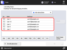Sie können die in der Liste angezeigten Empfänger filtern, indem Sie den Index am unteren Bildschirmrand, [Durch Name suchen] oder eine Adressliste im Pulldown-Menü der Adressliste auswählen.