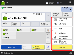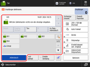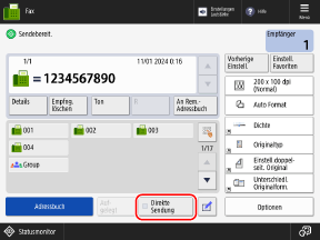 Das Fax kann an einen falschen Empfänger gesendet werden, wenn die Empfängereinstellung für das zuvor gesendete Fax bestehen bleibt. Setzen Sie die Einstellung zurück, bevor Sie den Vorgang ausführen.