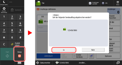 Stopp] gedrückt wird, wenn mehrere Sendeaufträge vorhanden sind Um einen anderen Auftrag abzubrechen, drücken Sie [Andere Aufträge prüf.], wählen Sie den abzubrechenden Auftrag aus der Sendeauftragsliste aus und drücken Sie [Abbrechen].