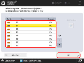 Wählen Sie die vertrauliche Faxeingangsbox, die als Weiterleitungsempfänger oder Speicherort verwendet werden soll, und drücken Sie [OK].