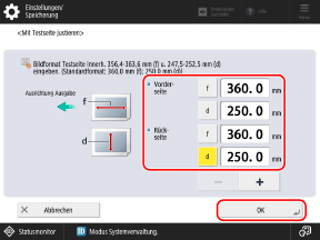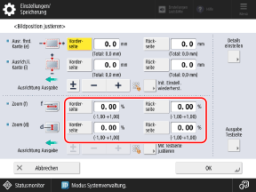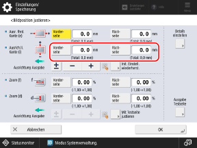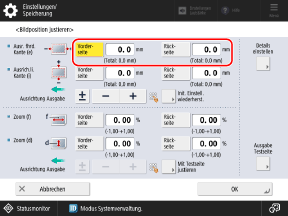 * Wenn Sie den Bildschirm [Bildposition justieren] aufrufen, nachdem Sie eine Anpassung der Ausrichtung an linker Kante oder der Ausrichtung an Vorderkante durchgeführt haben, wird der Wert auf dem Bildschirm auf "0,0 mm" zurückgesetzt, jedoch bleibt der zuvor eingestellte Wert erhalten. Wenn Sie die Anpassung wiederholen möchten, prüfen Sie das Zeichen auf der neu gedruckten Testseite, und stellen Sie diesen Wert ein.