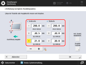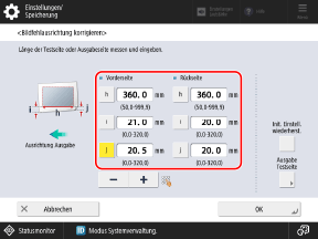 Geben Sie unter [Ausr. fhrd. Kante (e)] den Differenzbetrag zwischen dem vorgeschriebenen Wert (20,0 mm) und der in Schritt