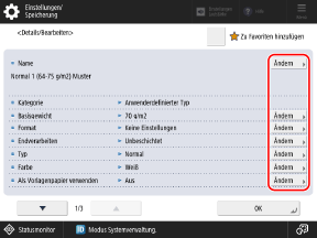 Sie können [Ändern] bei jedem Element drücken, um die Papiertyp-Informationen zu ändern.