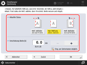 Drücken Sie bei [Falz/Heftposition ändern] auf [+], um die Position der Sattelheftung auf der Druckseite nach rechts zu verschieben, und auf [-], um die Position der Sattelheftung auf der Druckseite nach links zu verschieben.