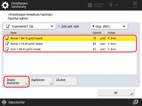 Wählen Sie das anwenderdefinierte Papier aus der Liste aus, und drücken Sie [Details/Bearbeiten].