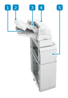 Um einen anderen Papiertyp als den des Hauptdokuments als Deckblatt oder Einlegeblatt einzuziehen, befestigen Sie Zuschiesseinheit R an einen der optionalen Finisher AG, Broschüren Finisher AG, Finisher AQ, oder Broschüren Finisher AQ.