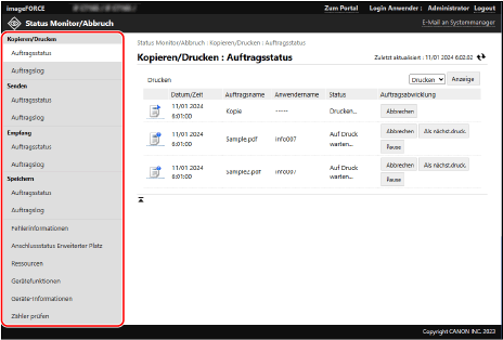 Sie können den Verarbeitungsstatus und die Protokolle der einzelnen Funktionen, den Betriebsstatus des Geräts und Fehlerinformationen über [Status Monitor/Abbruch] in Remote UI überprüfen.