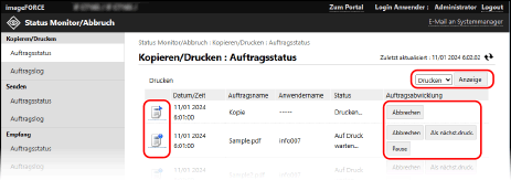 Wenn oben rechts auf dem Bildschirm ein Pulldown-Menü angezeigt wird, können Sie zwischen den Aufträgen wechseln, um anzuzeigen und zu speichern, was Sie benötigen. Wählen Sie die gewünschte Funktion aus dem Pulldown-Menü, und klicken Sie auf [Anzeige].
