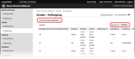 Klicken Sie auf [Im CSV-Format speichern], um die Auftragsprotokolle als CSV-Datei auf dem Computer zu speichern.