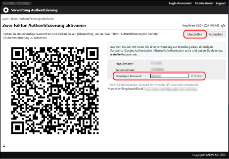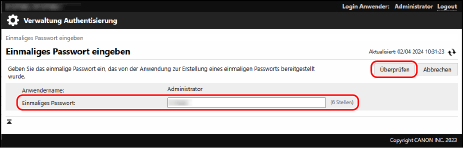 Geben Sie das Einmalpasswort auf dem Remote UI-Bildschirm ein, und klicken Sie dann auf [Überprüfen].