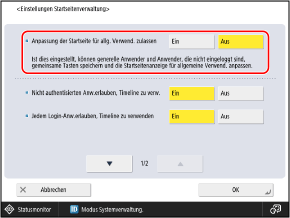 Setzen Sie diese Option auf [Ein], um anderen Benutzern als Administratoren das Hinzufügen von gemeinsam genutzten Schaltflächen und das Vornehmen von Änderungen an den Einstellungen [Anpas. für allg. Verwendung] zu erlauben.