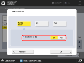 Um einen Bericht nur bei Auftreten eines Fehlers zu drucken, wählen Sie [Nur bei Fehler]. In diesem Fall setzen Sie [Drucken über Optionen zulassen] auf [Ein], wenn Sie in der Lage sein wollen, festzulegen, ob der Bericht über den Scan- oder Faxbildschirm gedruckt werden soll.
