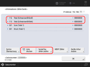 Sie können die Anzahl der gedruckten und kopierten Seiten überprüfen, indem Sie sich die Elemente ansehen, die auf dem Bildschirm [Informationen Zähler/Gerät] unter "Gesamt" oder "Kopie" angezeigt werden.