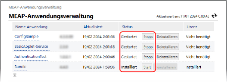 Klicken Sie auf [Gestartet] oder [Gestoppt] für die MEAP-Anwendung, deren Verwendung Sie starten oder stoppen möchten.