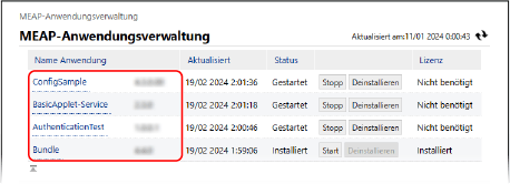 Sie können die Verwendung der MEAP-Anwendungen starten und beenden bzw. die Anwendungen deinstallieren. Sie können auch die Authentifizierungsinformationen der Anwendungen festlegen.