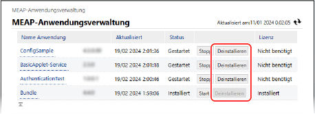 Klicken Sie auf [Deinstallieren] für die MEAP-Anwendungen, die Sie deinstallieren möchten.