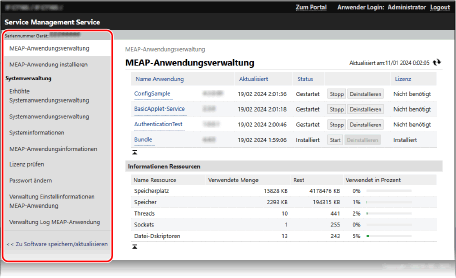 Auf diesem Bildschirm können Sie die MEAP-Anwendungen installieren sowie verwalten und auch das MEAP-System verwalten.