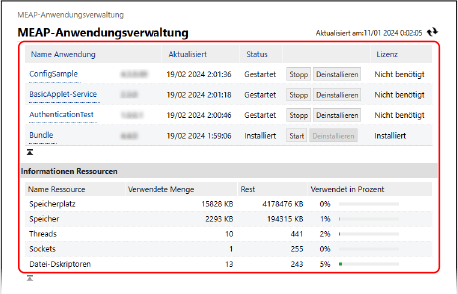 Sie können die Details der von allen MEAP-Anwendungen*1 gemeinsam genutzten Speicher- und anderen Ressourcen überprüfen, wie beispielsweise die genutzte Menge, die verbleibende Menge und die prozentuale Nutzung.