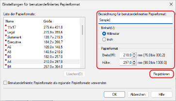 Geben Sie den Namen des benutzerdefinierten Formats und das Papierformat ein, und klicken Sie auf [Registrieren].