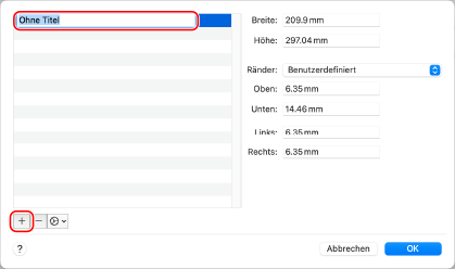 Klicken Sie unten links auf [+], klicken Sie auf [Ohne Titel] und geben Sie den Namen des anwenderdefinierten Papierformats ein.