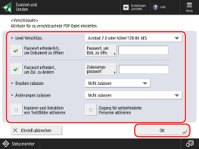 Wenn [Auf PDF/A formatieren] ausgewählt ist, deaktivieren Sie [Auf PDF/A formatieren], und drücken Sie dann [Verschlüsseln].