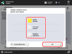Drücken Sie auf [Digit. Signaturen hinzu] oder [Signatur des Gerät hinzuf.].