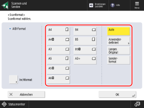 Wenn Sie das Format (Seitenlänge) des eingelegten Originals nicht kennen, drücken Sie [Sonderformat]. In diesem Fall brauchen Sie Schritt 2 (Eingabe der Seitenlänge) nicht auszuführen.