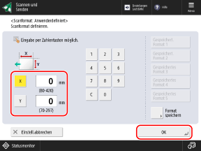 Gehen Sie wie folgt vor, um die Formate zu registrieren, wenn Sie häufig Originale verwenden, die nicht dem Standardformat entsprechen. Sie können das Format auf dem Formateingabebildschirm abrufen, so dass Sie das Format nicht jedes Mal neu eingeben müssen.