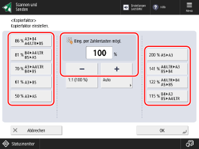 * Wenn diese Einstellung auf [Sonderformat] gesetzt ist, kann das Original nur in den Einzug gelegt werden. Außerdem wird das Verhältnis auf 1:1 (100 %) festgelegt.