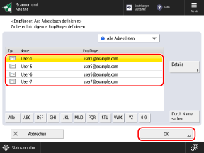 Wählen Sie auf dem Bildschirm Adressbuch den Empfänger (E-Mail-Adresse) aus, der als Empfänger-Notiz festgelegt werden soll, und drücken Sie [OK]