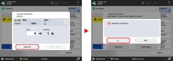 Stopp] gedrückt wird, wenn mehrere Sendeaufträge vorhanden sind Um einen anderen Auftrag abzubrechen, drücken Sie [Andere Aufträge prüf.], wählen Sie den abzubrechenden Auftrag aus der Sendeauftragsliste aus und drücken Sie [Abbrechen].