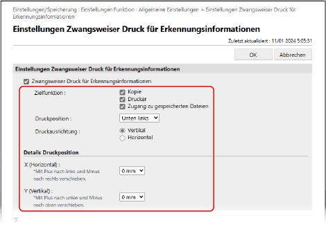 [Einstellungen Zwangsweiser Druck für Erkennungsinformationen].