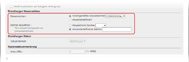 Um eine anwenderdefinierte Zeichenfolge einzubetten, wählen Sie [Anwenderdefiniert] unter [Wasserzeichen]. Wählen Sie [Anwenderdefinierte Zeichen] unter [Zeichen auswählen], und geben Sie die einzubettende Zeichenfolge ein.