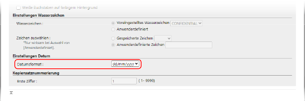 [Zeichen für Seitennum./Wasserz. speichern]Wenn das Druck- oder Kopierdatum eingebettet wird