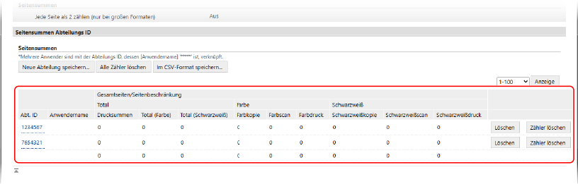 Sehen Sie sich unter [Seitensummen Abteilungs ID] die Nutzung an.