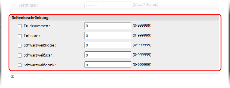 Um die Anzahl der Seiten, die gedruckt, gescannt oder kopiert werden kann, zu beschränken, wählen Sie das gewünschte Element aus, und geben Sie die maximale Anzahl der Seiten ein.