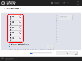Überprüfen Sie, ob die Formate des eingelegten Papiers auf dem Bildschirm [Einstellungen Papier] angezeigt werden.