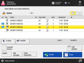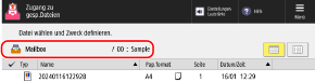 [Mailbox] auf dem Bildschirm [Startseite], und wählen Sie eine Mailbox aus, um den Bildschirm für die Dateiauswahl anzuzeigen.