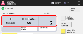 Das aktuell eingestellte Papier und die Anzahl der Ausdrucke werden in der Mitte des Bildschirms angezeigt. Überprüfen Sie diese Einstellungen, um einen korrekten Druck sicherzustellen.
