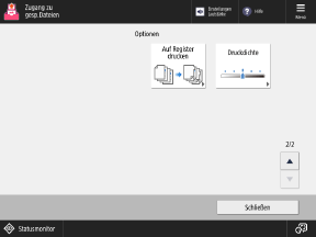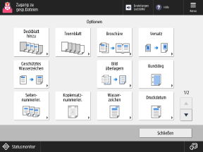 Drücken Sie die Tasten auf diesem Bildschirm, um die detaillierten Druckeinstellungen zu konfigurieren. Nachdem Sie die Druckeinstellungen konfiguriert haben, drücken Sie [Schließen], um zum Druckeinstellungsbildschirm zurückzukehren.
