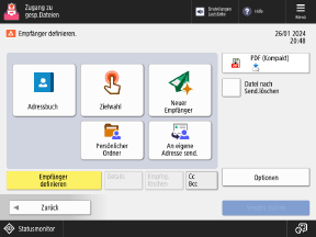 Drücken Sie auf [Adressbuch], [Zielwahl] oder [Neuer Empfänger], und geben Sie den Empfänger aus dem Adressbuch an oder geben Sie ihn direkt ein.