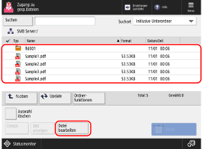 Über das Bedienfeld des Geräts können Sie die folgenden Vorgänge für Dateien ausführen, die im Erweiterter Platz auf einem anderen Gerät oder einem Dateiserver (Windows-Server) im Netzwerk gespeichert sind:
