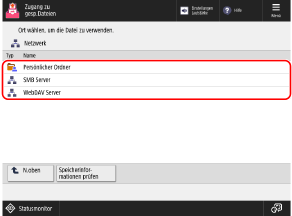 Drücken Sie [Speicherinformationen prüfen], wählen Sie das Verbindungsziel aus und drücken Sie [Details], um das Protokoll und den Pfad des Verbindungsziels zu prüfen.