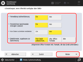 * Auch wenn diese Einstellung auf [Ein] gesetzt ist, kann ein Administrator mit Administratorrechten Dateien und Ordner speichern, erstellen und löschen, während er von außen auf den Erweiterter Platz zugreift (nur gemeins. Speicherplatz).
