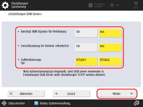 Konfigurieren Sie die Verschlüsselungs- und die Authentisierungseinstellungen, und drücken Sie [Weiter].
