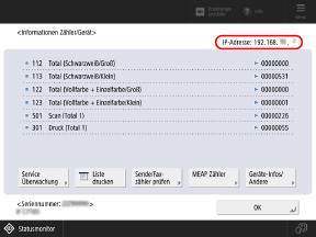 Drücken Sie auf dem Bedienfeld im Bildschirm [  ] oder einem anderen Bildschirm auf [Startseite], um den Bildschirm [Informationen Zähler/Gerät] anzuzeigen, und überprüfen Sie die IPv4-Adresse. * Wenn das Gerät gleichzeitig mit zwei verschiedenen Netzwerken verbunden ist, werden die IPv4-Adressen der Haupt- und Nebenleitungen nebeneinander angezeigt. |