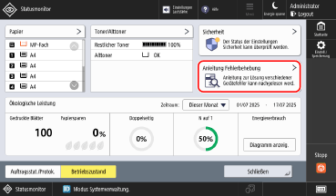 Die Informationen zur Behebung von Problemen beim Drucken, Faxen und Senden von gescannten Daten finden Sie in der [Anleitung Fehlerbehebung] im Betriebsstatus des Geräts.