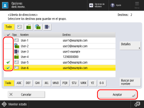 Seleccione las casillas de los destinos a registrar en el grupo y pulse [Aceptar].