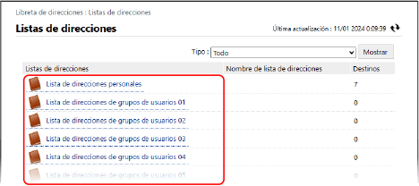 Página del portal de la IU remotaAparece la pantalla [Listas de direcciones].