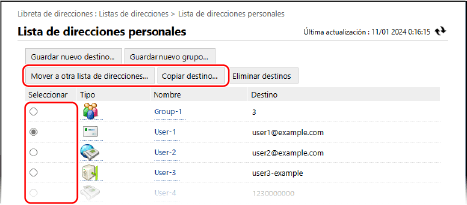 Seleccione el destino a mover o copiar y haga clic en [Mover a otra lista de direcciones] o Copiar destino[].